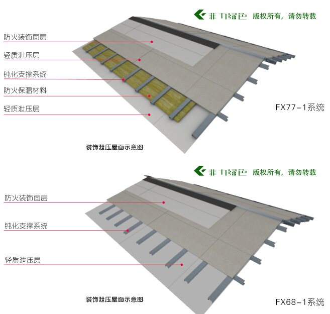 裝飾(shì)泄爆(bào)屋麵主要(yào)由專(zhuān)業防水層、防水泄爆層、保溫防火材料和鈍化支撐骨架和構成的保溫裝飾一體化屋麵。泄爆屋麵適用(yòng)於單(dān)層廠(chǎng)房或多層廠房頂層,可以有效增加泄壓麵積,是對泄爆外牆的有效補充。